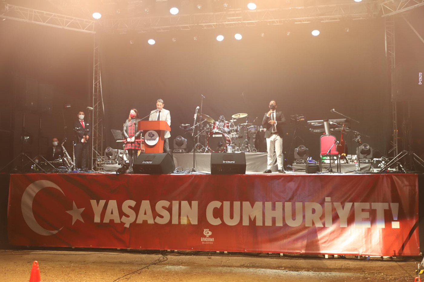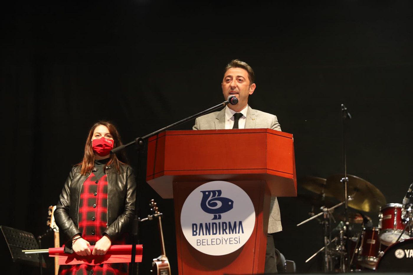 29 EKİM COŞKUSU YENİ TÜRKÜ KONSERİ İLE KUTLANDI 29 Ekim Cumhuriyet Bayramı kapsamında Bandırma Belediyesi tarafından Yeni Türkü konseri Pandemi nedeniyle arabalı olarak gerçekleştirildi. Şoförler ve Otomobilciler Odası Düğün Salonu Arkası Kamyon Parkında gerçekleştirilen konsere vatandaşlar sosyal mesafe kuralına uyarak Yeni Türkü’nün şarkılarına ve okunan marşlara coşku ile eşlik ettiler. Ayrıca konser Bandırma Belediyesi’nin sosyal medya hesaplarından canlı olarak yayınlandı. Konserde Belediye Başkanı Av. Tolga Tosun günün anlam ve önemine dair Yeni Türkü Gurubu solisti Derya Mustafa Köroğlu’na çiçek ve Bandırma Vapuru tablosu hediye etti.