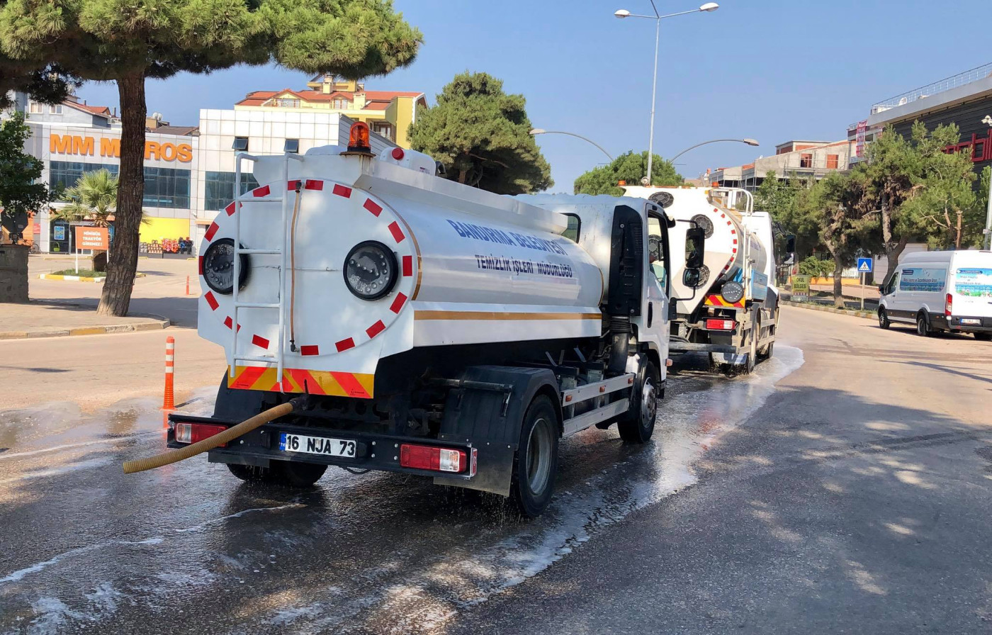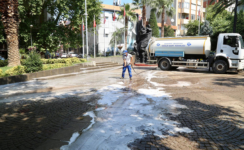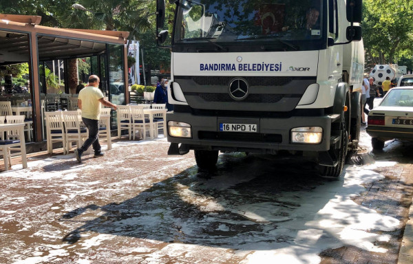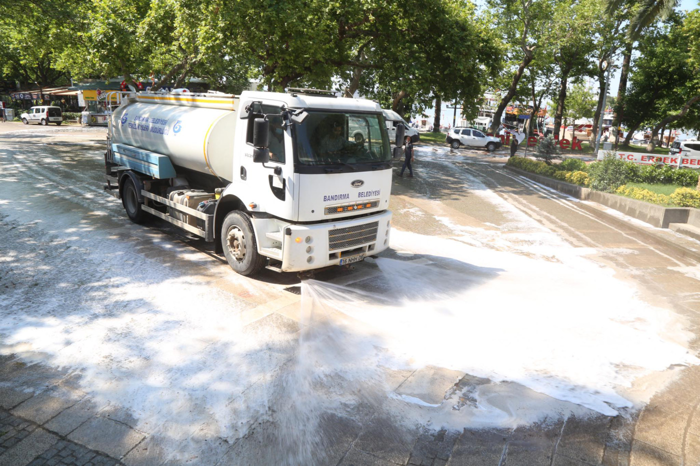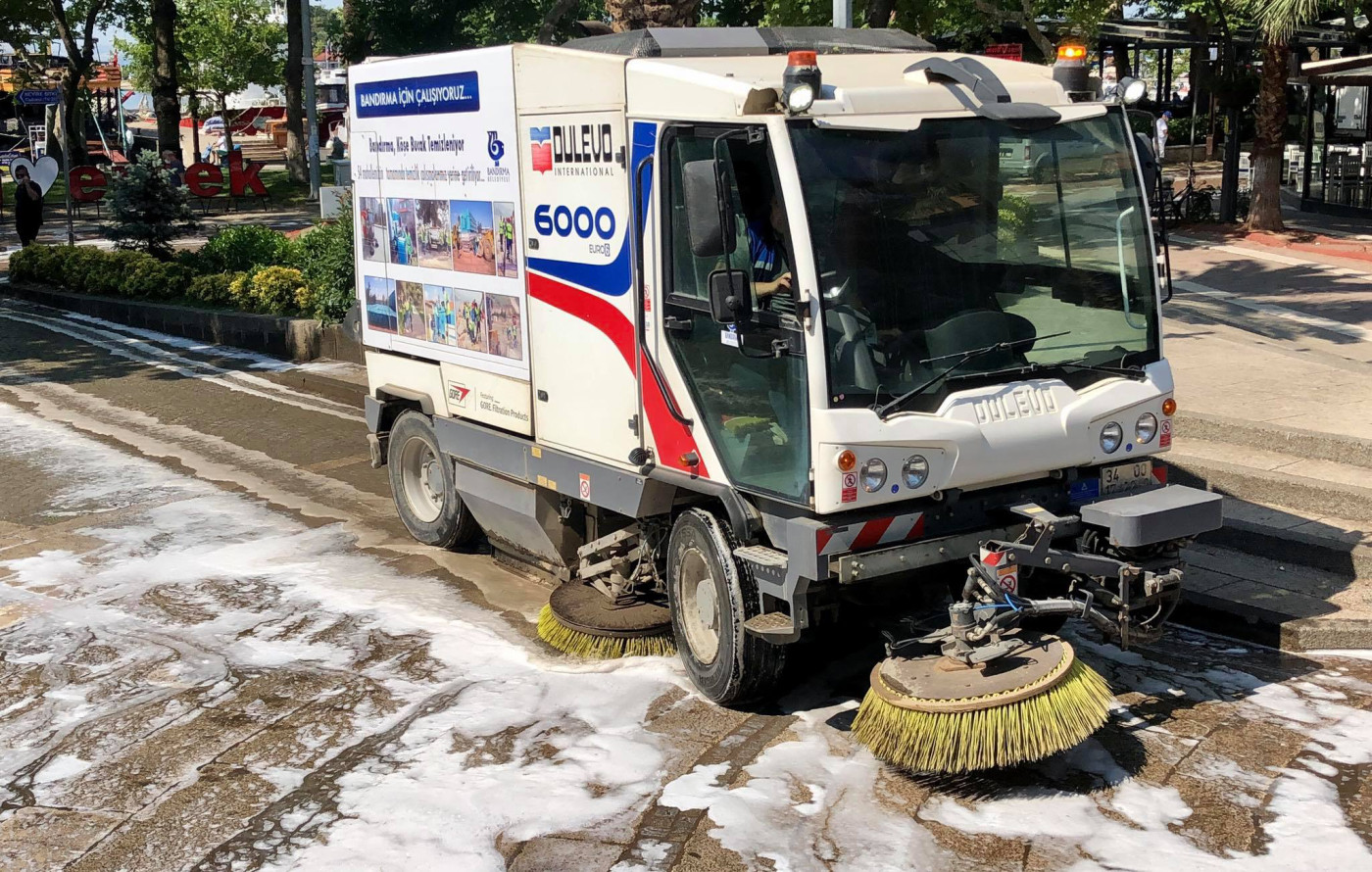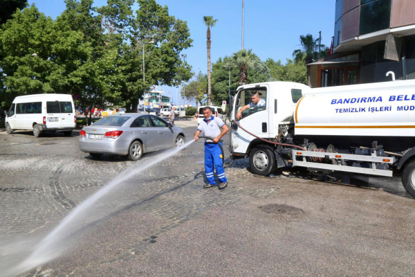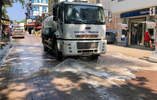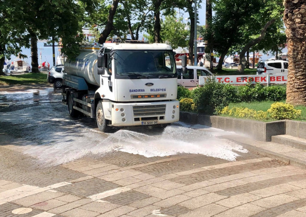 BANDIRMA BELEDİYESİ’NDEN ERDEK’E TEMİZLİK DESTEĞİ   Bandırma Belediyesi, yaz dönemi nedeniyle turizm yoğunluğunun arttığı Erdek’te temizlik çalışmalarına destek verdi. Ekiplerin yerine getirdiği çalışmalar kapsamında Erdek’in dört bir tarafı Bandırma Belediyesi temizlik ekipleri tarafından köşe bucak temizlendi.   Yapılan temizlik çalışmalarında Erdek’in tüm ana caddeleri, sahil boyunun tamamı, Belediye Meydanı, Anıtlar ve çocuk parkları önce süpürge araçlarıyla temizlendi. Ardından da köpüklü dezenfektanla tüm bu alanlar yıkanarak temiz bir hale getirildi.