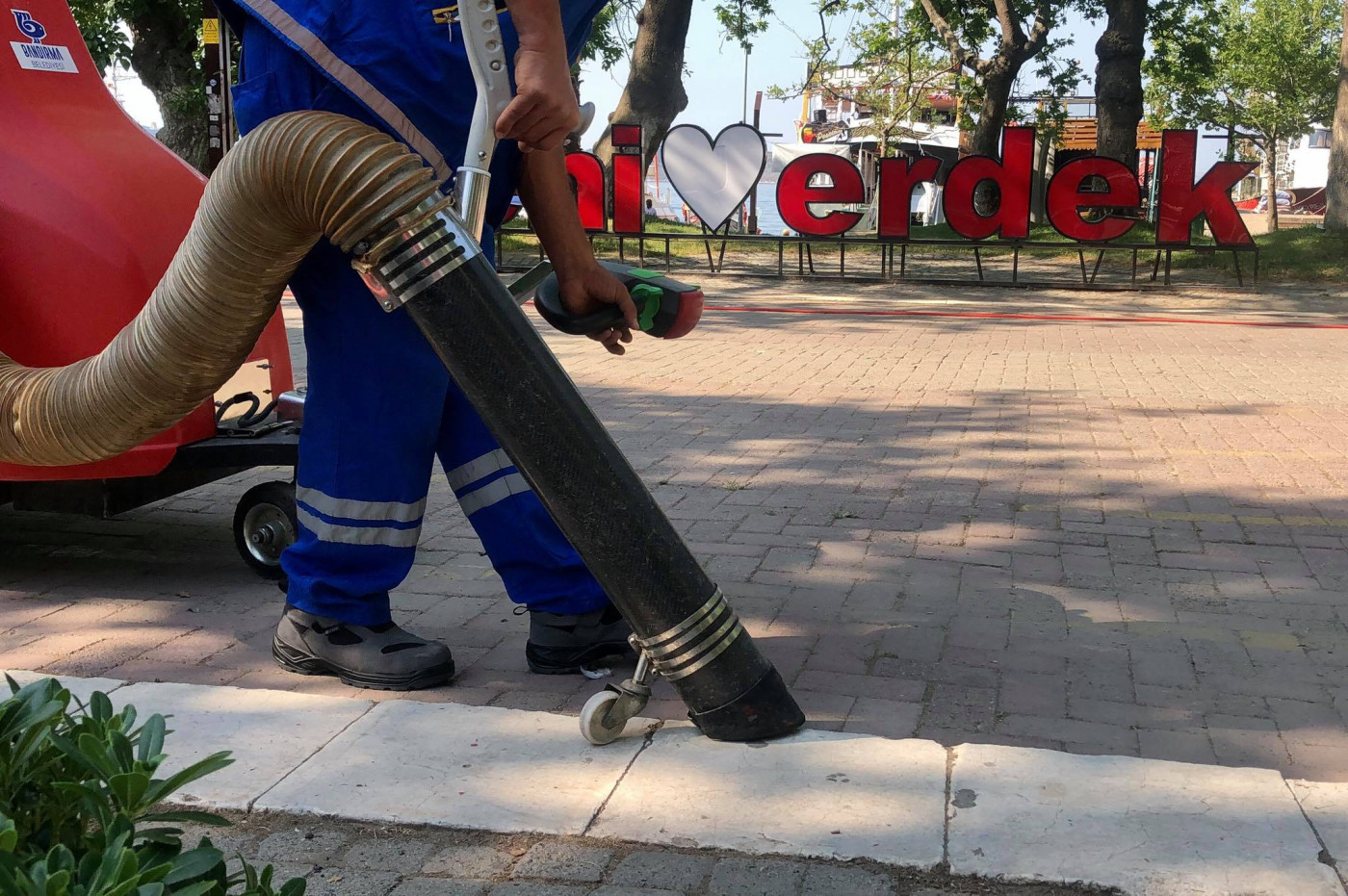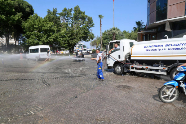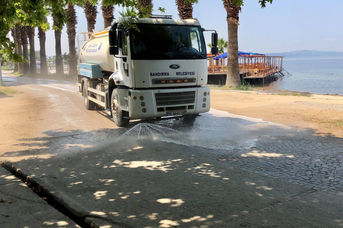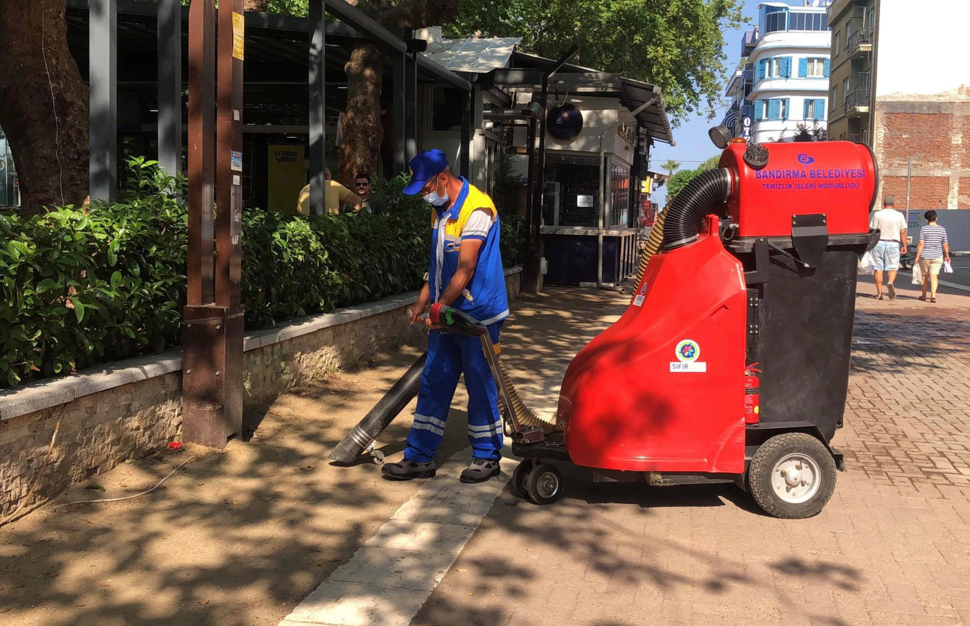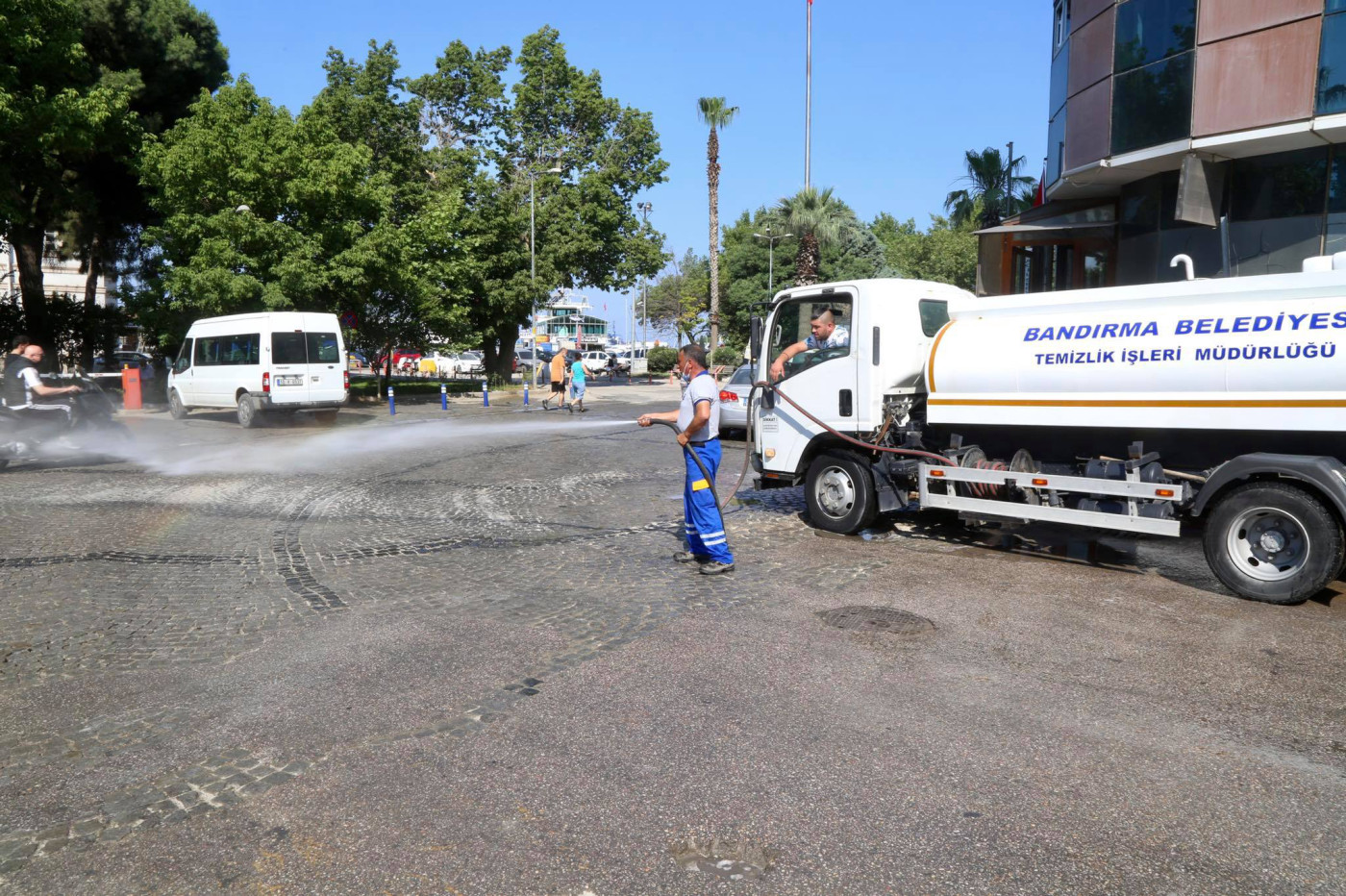 BANDIRMA BELEDİYESİ’NDEN ERDEK’E TEMİZLİK DESTEĞİ   Bandırma Belediyesi, yaz dönemi nedeniyle turizm yoğunluğunun arttığı Erdek’te temizlik çalışmalarına destek verdi. Ekiplerin yerine getirdiği çalışmalar kapsamında Erdek’in dört bir tarafı Bandırma Belediyesi temizlik ekipleri tarafından köşe bucak temizlendi.   Yapılan temizlik çalışmalarında Erdek’in tüm ana caddeleri, sahil boyunun tamamı, Belediye Meydanı, Anıtlar ve çocuk parkları önce süpürge araçlarıyla temizlendi. Ardından da köpüklü dezenfektanla tüm bu alanlar yıkanarak temiz bir hale getirildi.