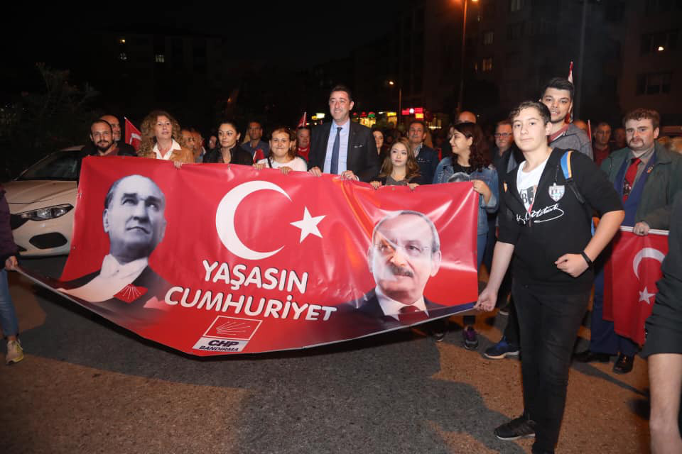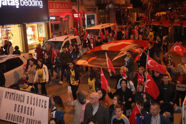 BANDIRMALILARDAN CUMHURİYET YÜRÜYÜŞÜNE COŞKULU KATILIM   Cumhuriyet’in ilan edilişinin 96’ncı yılı nedeniyle kentimizde düzenlenene Cumhuriyet yürüyüşüne binlerce vatandaş katıldı.   Ordu caddesi Migros önünde toplanan binlerce kişi, Ulu Önder Mustafa Kemal Atatürk'e ve onun bizlere emanet ettiği Cumhuriyet’e sahip çıkarak, Ellerinde Türk bayrağı dillerinde Cumhuriyet marşlarıyla Bandırma sokaklarında görsel bir şölen yaşattı.