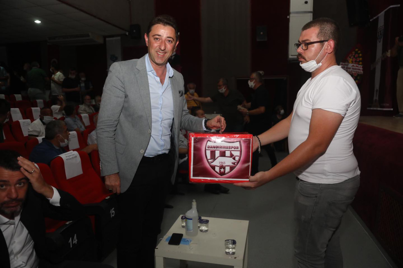 BAŞKAN AV. TOLGA TOSUN BANDIRMASPOR OLAĞANÜSTÜ KONGRESİNE KATILDI   Belediye Başkanı Av. Tolga Tosun, Barış Manço Kültür Merkezinde Valilik izni ile Pandemi kurallarına dikkat edilerek gerçekleştirilen Bandırmaspor Olağanüstü Genel Kurul Kongresine katıldı. Kongre sonunda konuşma yapan Belediye Başkanı Av. Tolga Tosun: “Bandırmasporumuzun Genel kurulu hepimize hayırlı olsun. Bende geçmiş dönemde Mehmet Kılkışlı Başkanımız dönemimde Bandırmaspor yöneticiliği yapmış bir kardeşinizim bu yüzdende spor kulüplerinin ve Bandırmasporumuzun sıkıntılarını iyi biliyorum. Geçen sezon son anda ligte tutunarak kalan takımımız bu yıl şampiyon olarak TFF 1.Lige çıkma başarısını gösterdi. Hakkımız olan bir şampiyonluktu. Kentimizin en önemli markası olan Bandırmasporumuzu 1.Ligde kalıcı olarak tutabilirsek inanıyorum 3 yada 4 yıl içinde Süper ligi zorlar duruma gelen bir takım oluruz. Ben bugün burada Bandırmaspor Başkanlığına seçilen Onur Göçmez arkadaşımızı yürekten kutluyorum. Geçmiş dönem başkanımız Göksel Karlahan’a da bugüne kadar vermiş olduğu emekleri için teşekkür ediyorum. Tüm Bandırma halkı olarak Bandırmaspora gönül verenler olarak Bandırmasporumuza destek olalım. Bandırma Belediyesi olarak imkanlarımızın ölçüsünde Bandırmasporumuzun her zaman yanında olduk ve Onur Başkanımızın Başkanlığı döneminde de destek olmaya devam edeceğiz” dedi.