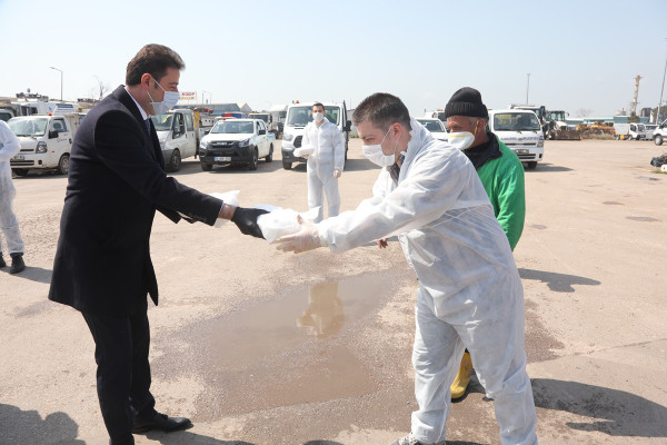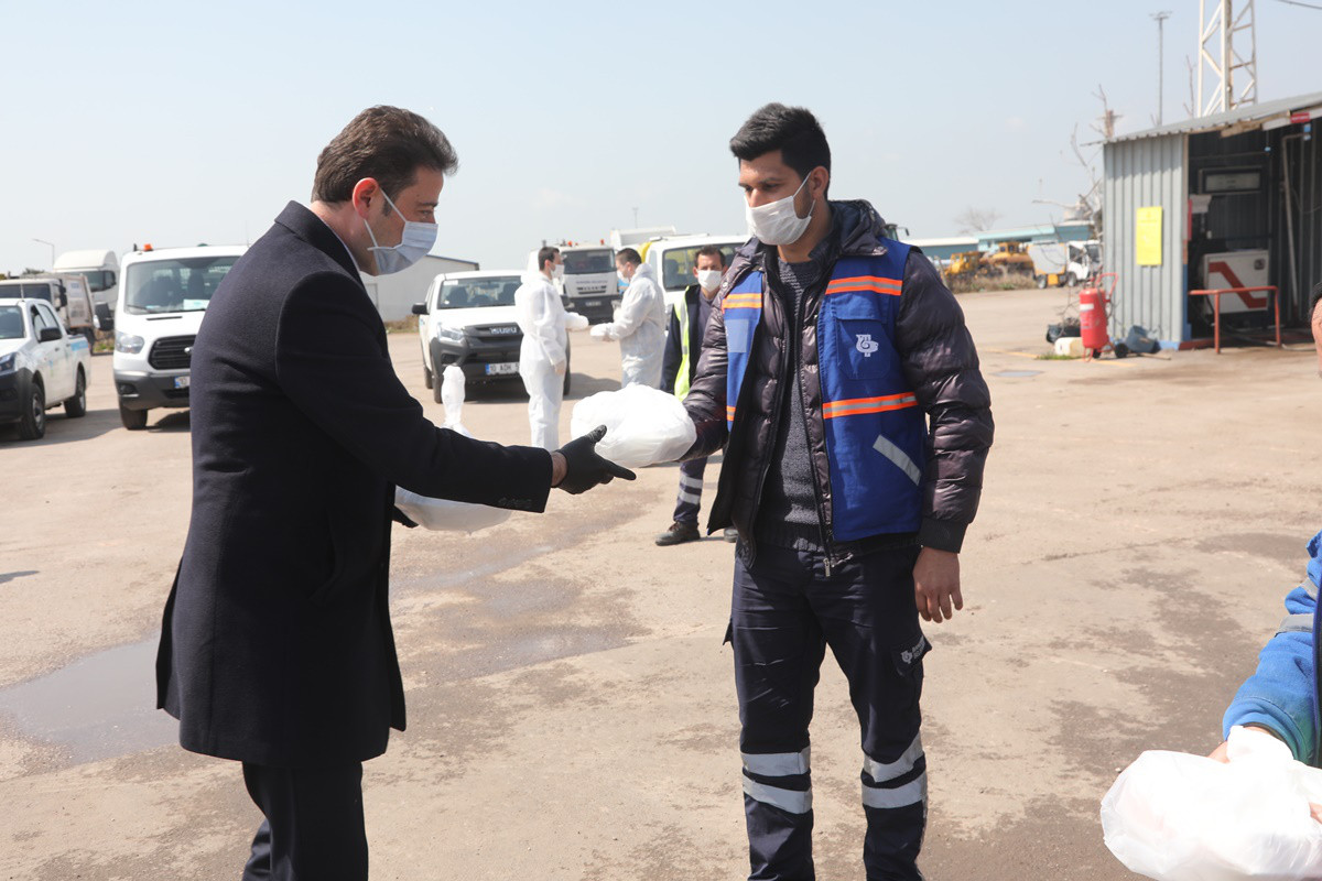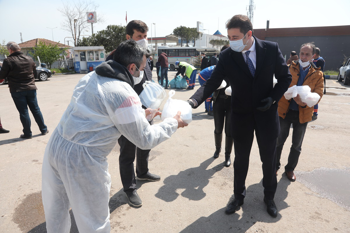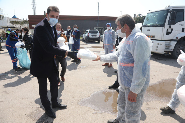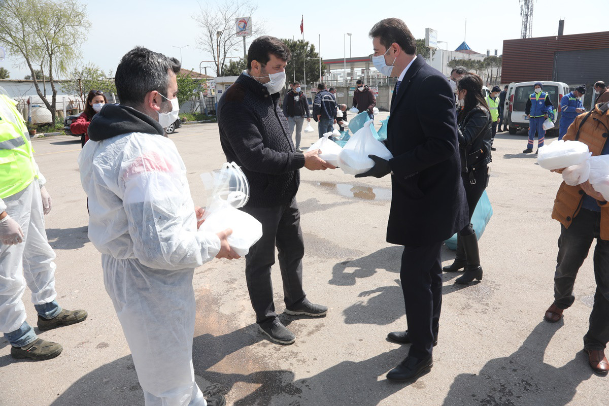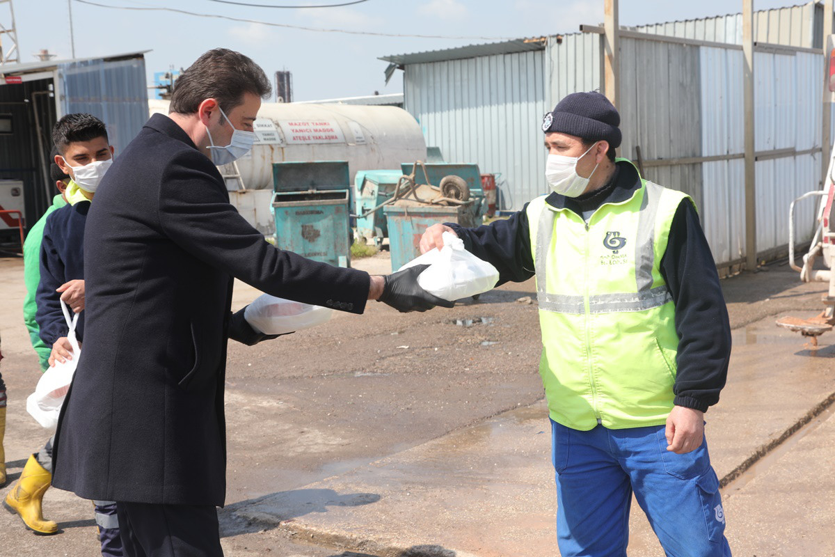 BAŞKAN TOLGA TOSUN, İLAÇLAMA VE DEZENFEKTAN EKİPLERİNE TEŞEKKÜR ETTİ. Belediye Başkanı Av. Tolga Tosun, ilaçlama ve dezenfektan ekibiyle bir araya gelerek yoğun ve özverili çalışmalarından dolayı kendilerine teşekkür etti. Covid-19 salgınıyla mücadele çalışmaları kapsamında Sağlık ve Temizlik İşleri Müdürlüğü ekiplerinden oluşturularak salgının ülkemizde görüldüğü ilk günden bu yana tüm kent genelinde yoğun bir çalışma gerçekleştiren ilaçlama ve dezenfektan ekibini ziyaret eden Başkan Tolga Tosun, bu süreçte gece gündüz demeden özveriyle çalışan ekiplere kumanya dağıtımı gerçekleştirerek teşekkür etti. Belediye Şantiyesinde ekiplerle bir araya gelen Başkan Tolga Tosun: “Ülkemiz ve tüm dünya şu an bir salgının yarattığı olumsuzlukları en aza indirgemeye çalışıyor. Dünyanın her bir yerinde salgınla mücadele etmek adına çeşitli önlemler ve çalışmalar yapılıyor. Bizler de salgının ülkemizde görüldüğü ilk andan itibaren hiç zaman kaydetmeden kentimizde bir dizi tedbirler alarak hijyen ve dezenfektan çalışmalarımızı yerine getirdik. Bunun birlikte halk sağlığı ve salgının yayılımını en aza indirmek adına faklı birçok uygulamayı gerçekleştirdik. Bu çalışmalarımızda ön planda olarak yoğun bir çalışma ve  özveri gösteren dezenfektan ekiplerimize destek olmak amacıyla bugün bir araya geldik ve öğlen molasında çeşitli kumanyalarımızı dağıttık. Kendilerine bir kez daha özverili çalışmalarından dolayı müdüründen personeline kadar hepsine teşekkürlerimi sunuyorum” dedi.