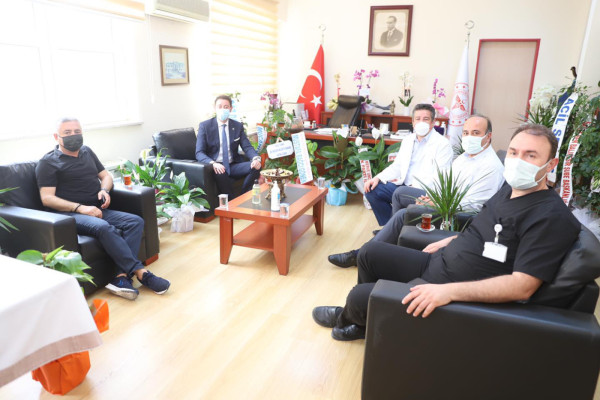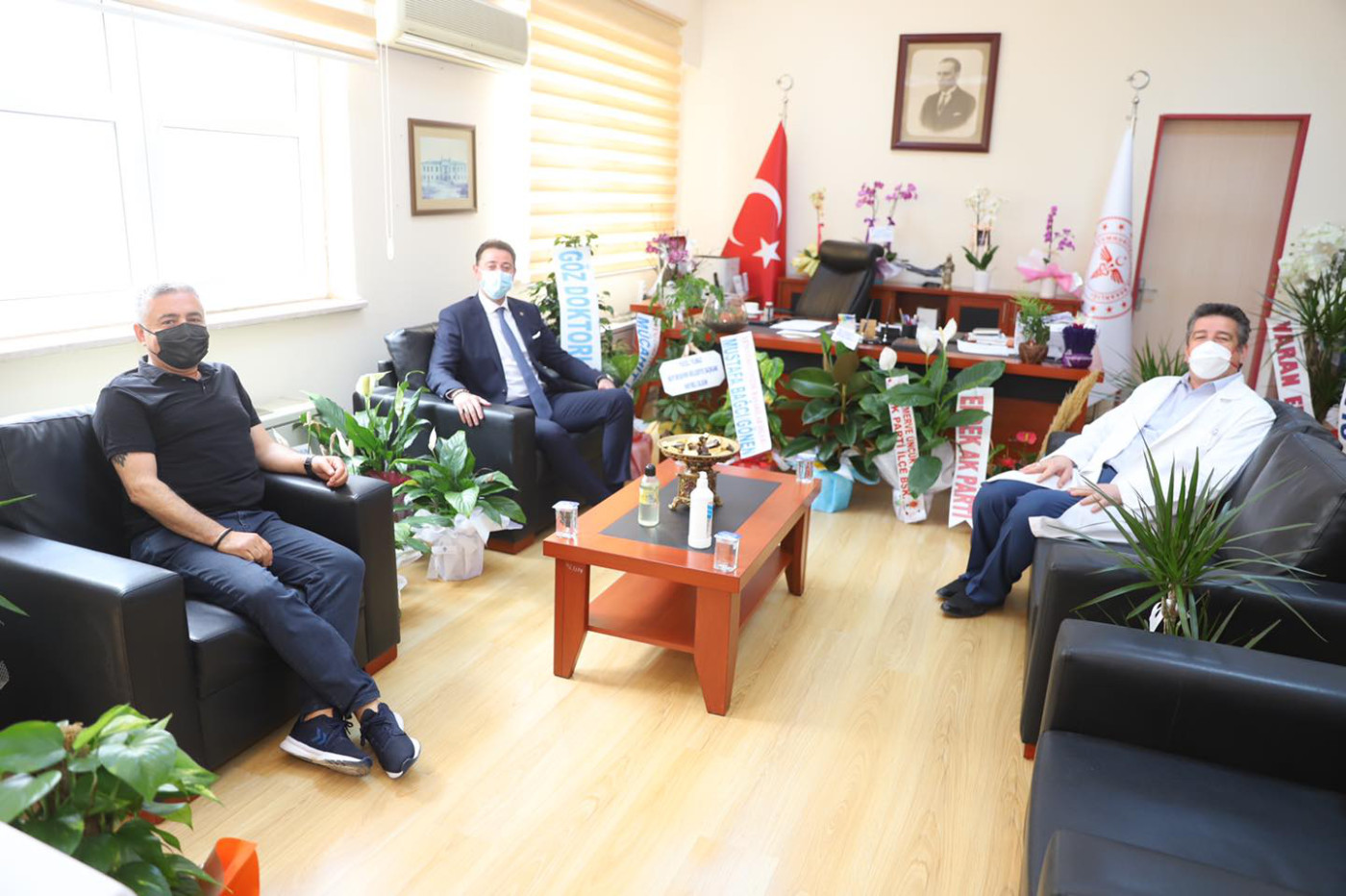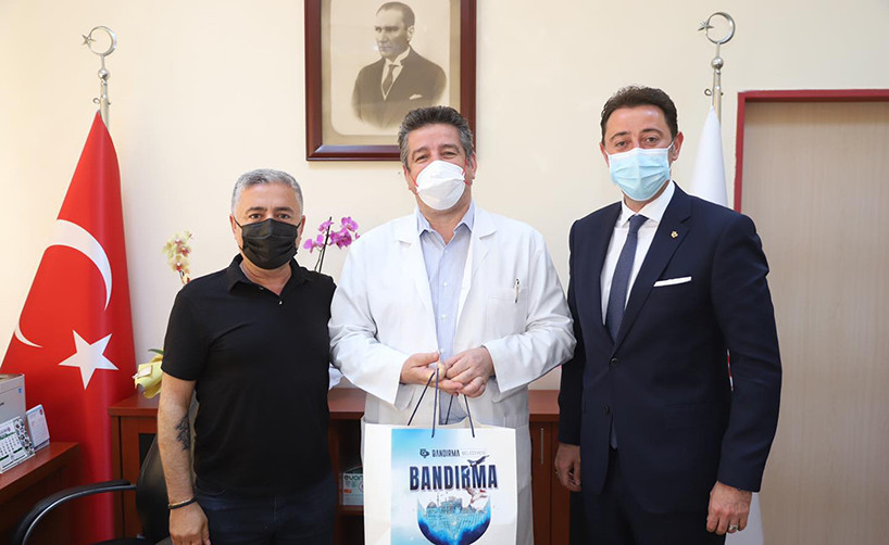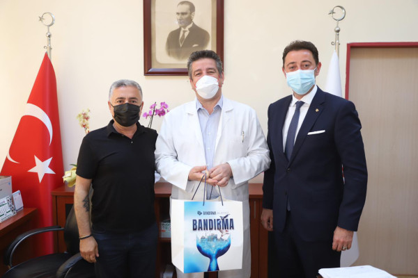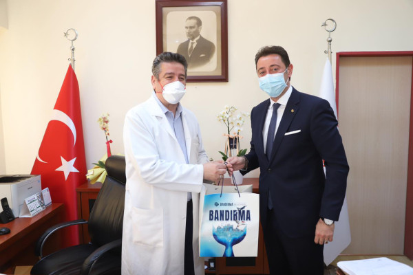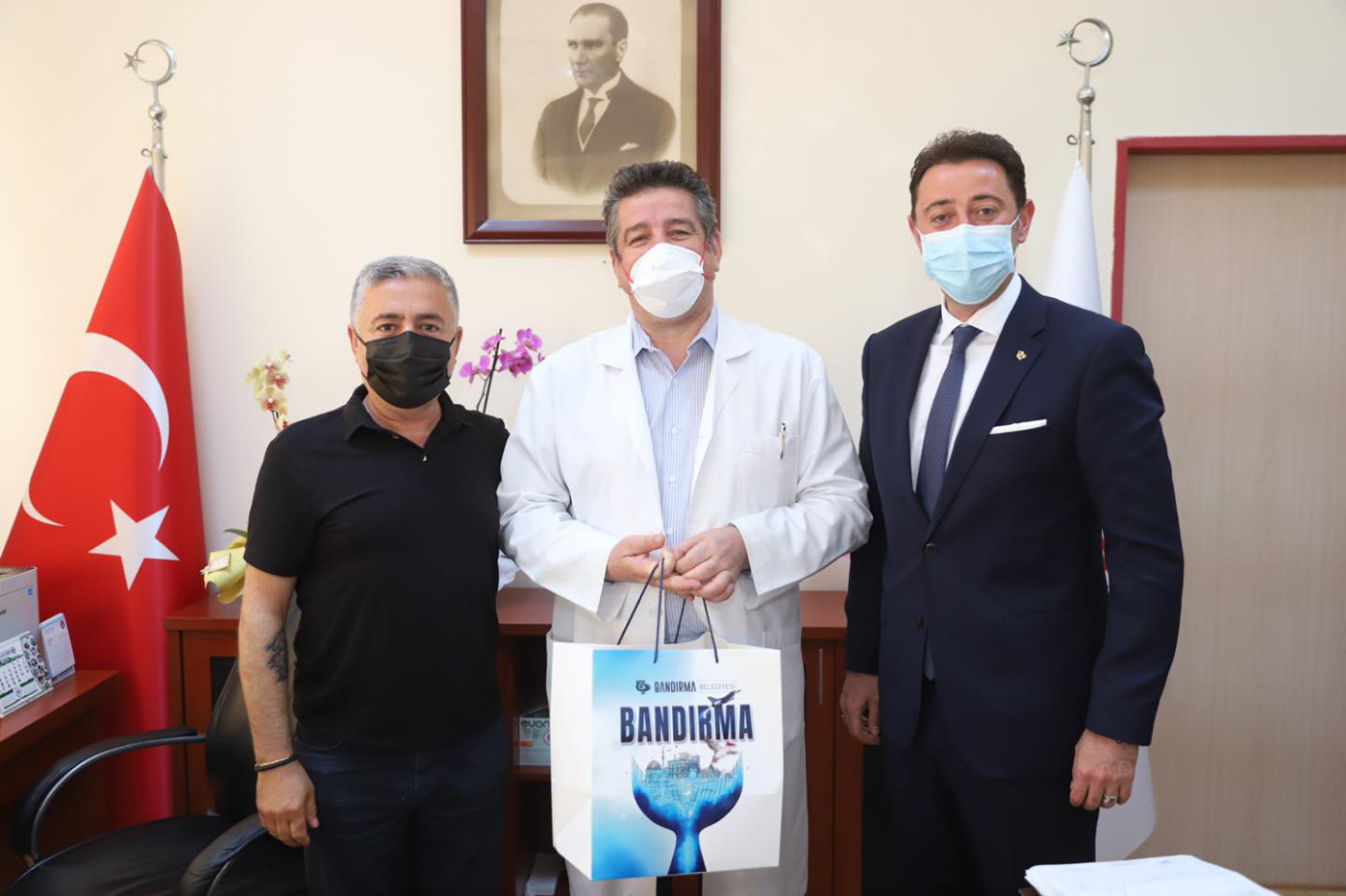 BAŞKAN TOLGA TOSUN’DAN BAŞHEKİM’E HAYIRLI OLSUN ZİYARETİ   Belediye Başkanı Av. Tolga Tosun, Meclis Üyesi Sıtkı Ağan ile birlikte Bandırma Eğitim ve Araştırma Hastanesi Başhekimliğine atanan Dr. Öğretim Üyesi Muzaffer Şenveli’yi ziyaret ederek, yeni görevinin hayırlı olmasını diledi.   Ziyarette Başhekim Yardımcısı Uzman Dr. Nart Görgü ve Hastane İdari ve Mali İşler Müdürü Mülkü Serbesd’te yer aldı.   Belediye Başkanı Av. Tolga Tosun: Kısa zaman önce Araştırma hastanesi olan kentimizin önemli kurumlarından olan Bandırma Eğitim ve Araştırma Hastanemiz personeli ile Bandırmamıza ve bölgemiz halkına en iyi hizmetleri sunacağınıza inanıyor çalışmalarınızda başarılar diliyorum” dedi.   Bandırma Eğitim ve Araştırma Hastanesi Başhekimi Dr. Öğretim Üyesi Muzaffer Şenveli: “Bandırma Belediye Başkanımız Av. Tolga Tosun’a ziyaretlerinden dolayı teşekkür ediyorum. Yeni görevimizde inşallah yakın zamanda hizmete açılan Bandırma Eğitim ve Araştırma Hastanemiz, çalışanlarımızla birlikte şehrimize ve bölgemiz halkına en iyi hizmeti sunmak için çalışacağız” diye konuştu.