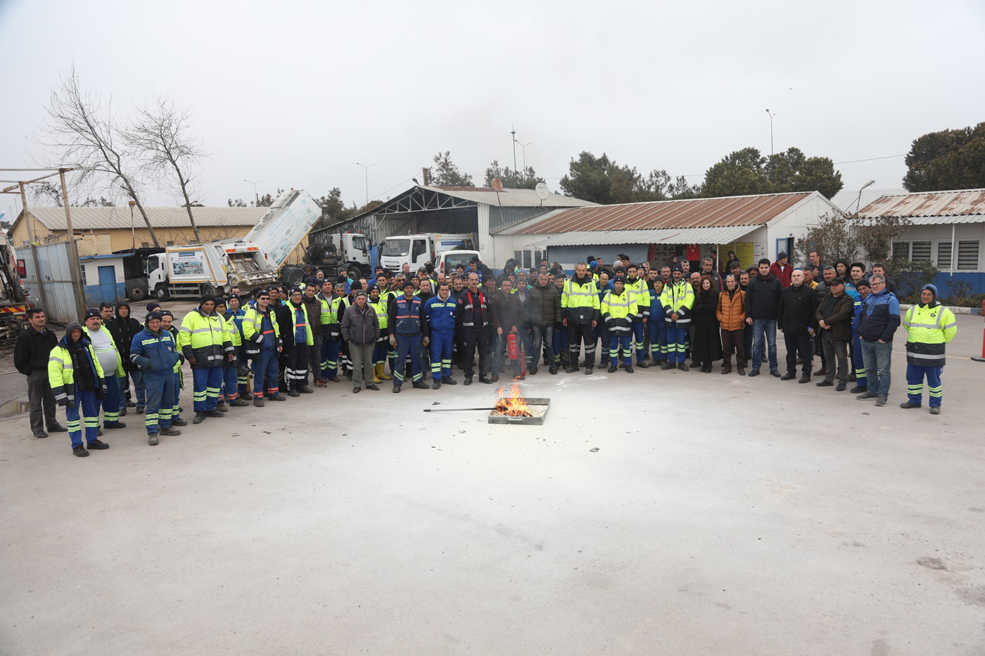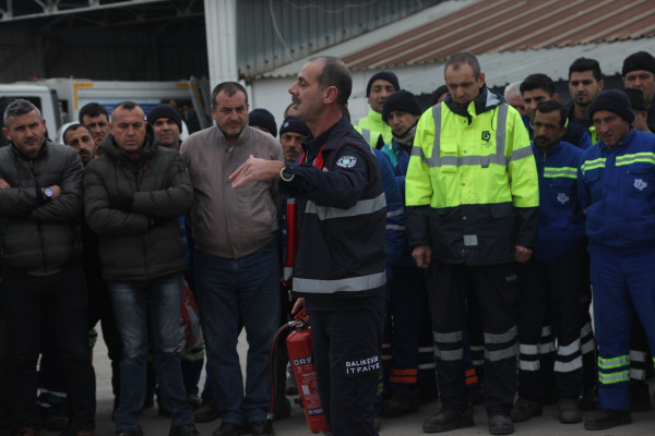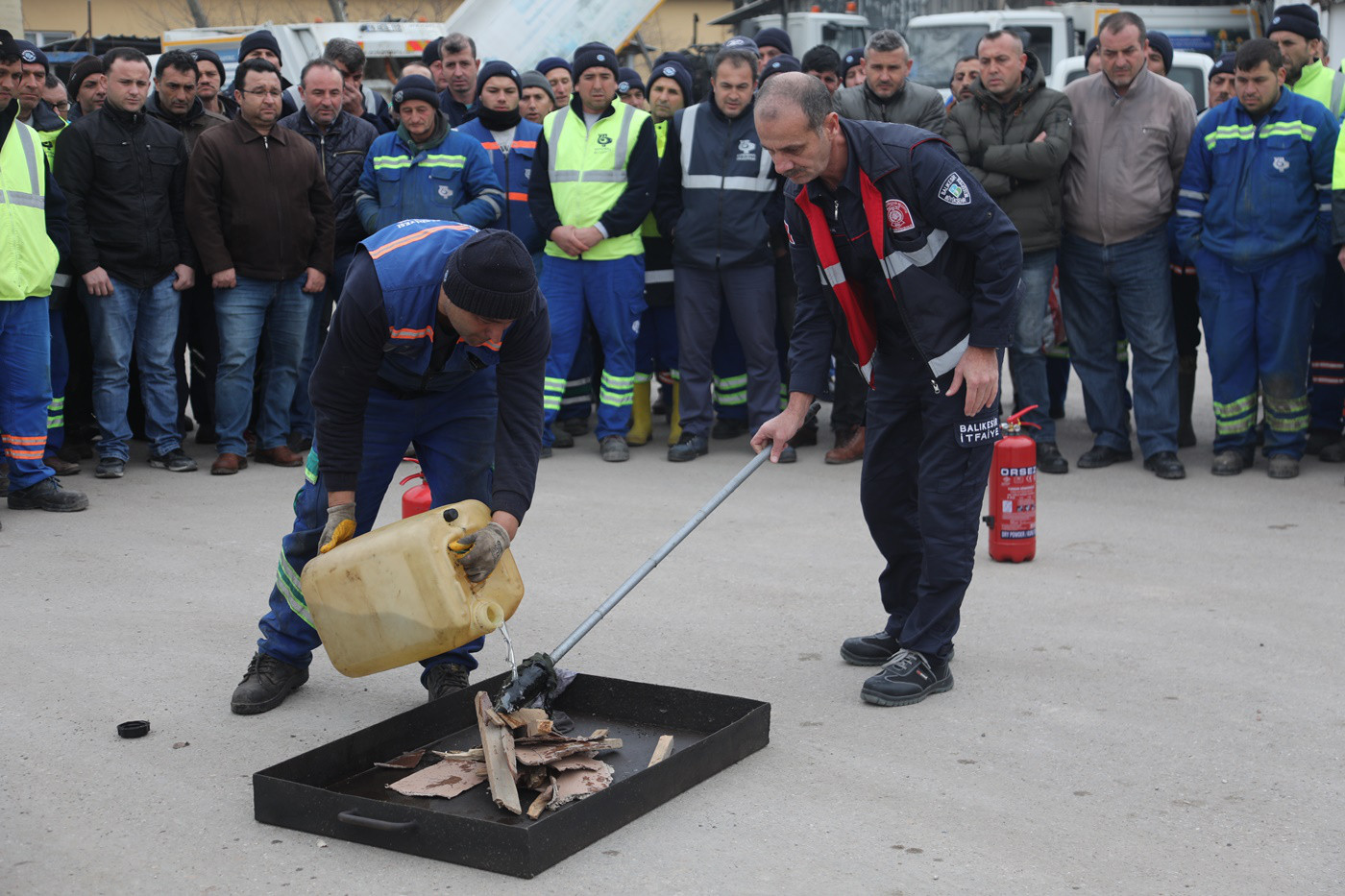 BELEDİYE ŞANTİYESİNDE YANGIN TATBİKATI. Temizlik İşleri Müdürlüğü, Bandırma Belediyesi Şantiyesinde yer alan çalışma sahasında bir yangın tatbikatı gerçekleşti. Tatbikatta Belediye Başkan Yardımcısı Ozan Onur, Daire Müdürü Zafer Ekşi ve çok sayıda personel yer aldı. Balıkesir Büyükşehir Belediyesi Bandırma İtfaiye Grup Amirliği ve Bandırma Belediyesi İş Güvenliği Uzmanlarının da katkılarıyla düzenlenen Yangın Tatbikatında ilgili Temizlik İşleri Personeline yangın sınıfları, söndürme yöntemleri, kullanılacak söndürme maddeleri ve dikkat edilecek hususlar konusunda eğitim verildi. Yangında ilk adımda yapılacaklar ve alınması gereken tedbirlerin anlatıldığı eğitimde, teorik olarak verilen bilgiler yangın söndürme tatbikatıyla pratiğe taşındı. Eğitimin ardından personele uygulamalı yangın tatbikatı yaptırıldı.