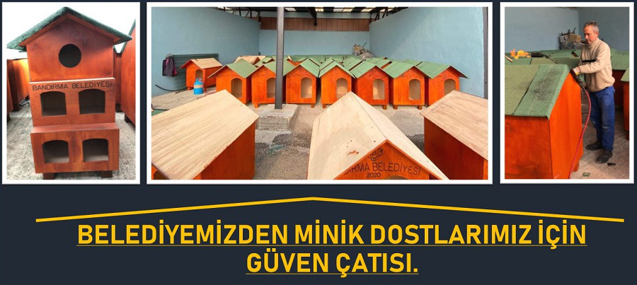 BELEDİYEMİZDEN MİNİK DOSTLARIMIZ İÇİN GÜVEN ÇATISI. Bandırma Belediyesi tarafından kentimizdeki minik dostlarımızın güvenle barınmasını sağlamak amacıyla yeni kulübeler ve kedi evlerinin üretimine geçildi. Üretim aşamasının ardından kulübeler ve kedi evleri başta Belediye Sokak Hayvanları Geçici Bakım Evi bünyesine ve sokak hayvanlarının kentimizin faklı noktalardaki beslenme alanlarına yerleştirilecek.   Belediye Destek Hizmetleri Müdürlüğü ekiplerince yapımına başlanan yeni kulübeler, sokak hayvanlarının yağmurlu ve soğuk havalarda daha güvenli ve korunaklı bir şekilde barınmalarını sağlamak amacıyla üretildi. İlk etapta 50 adet köpek kulübesi ve 10 adette kedi evinin yapımı tamamlanırken ilerleyen aşamalarda ihtiyaç alanlarına göre yeni kulübelerin üretimine devam edilecek.
