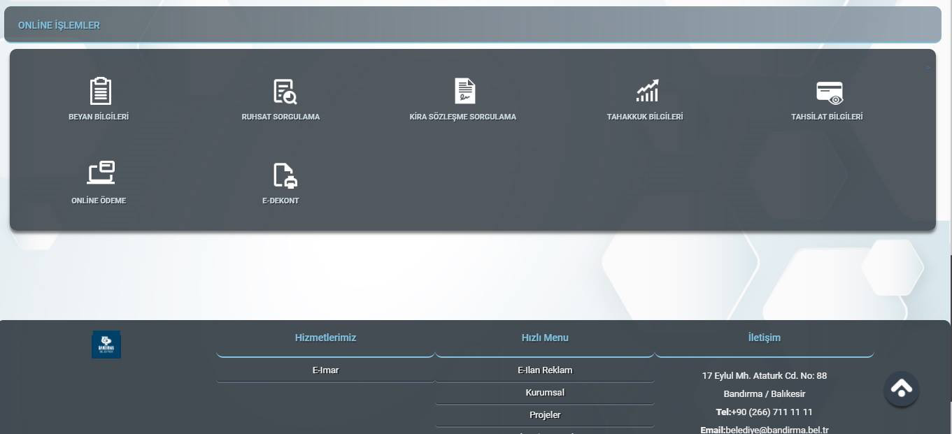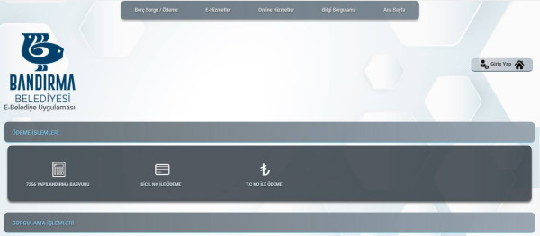 BORÇ YAPILANDIRMALARINIZI EVİNİZDEN DE YAPABİLİRSİNİZ.   Yeni uygulamayla vatandaşlarımız belediyemize gelmeden her tülü borç yapılandırmalarını Bandırma Belediyesi resmi internet sayfası olan “www.bandirma.bel.tr” sayfasından yapabilirler.   Belediyemizin resmi sayfasında “E-BELEDİYE” sekmesinin altında yer alan “Online İşlemler” sekmesine girerek “Bandırma Belediyesi E-Belediye Uygulaması” sayfasından yıl sonuna kadar devam eden Belediyemize ait tüm borç ve ödemelerle ilgili yapılandırmalarını veya ödemelerini buradan yapabilirler.