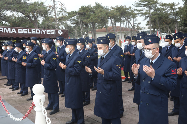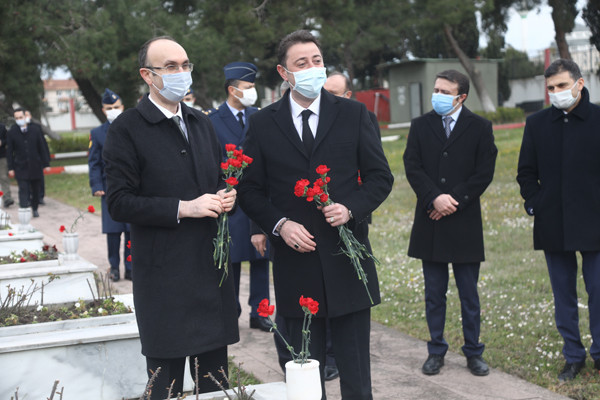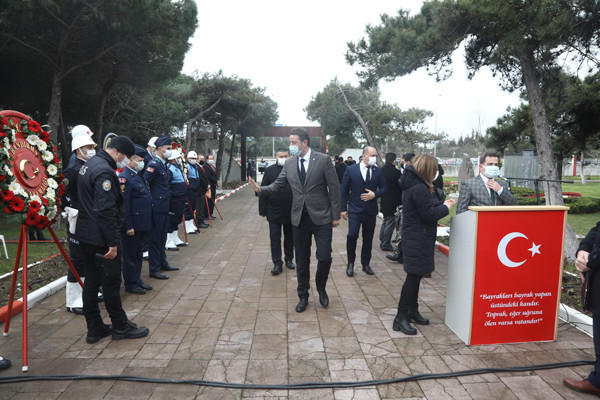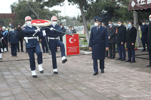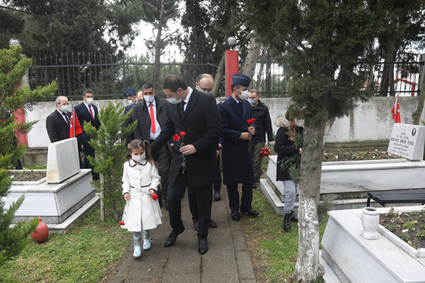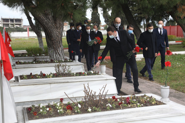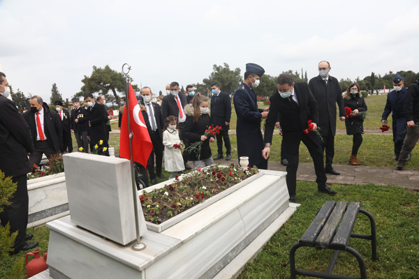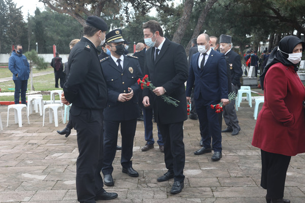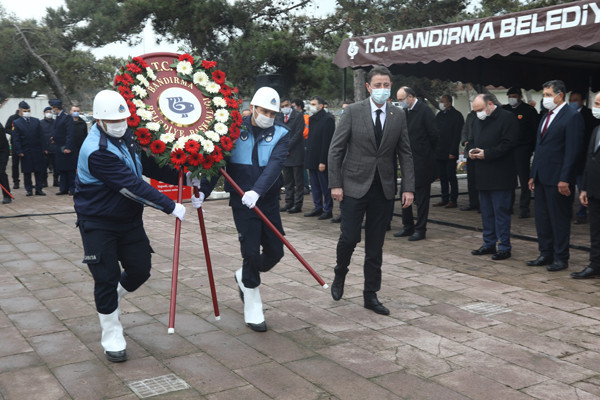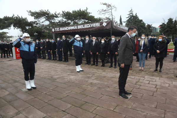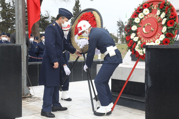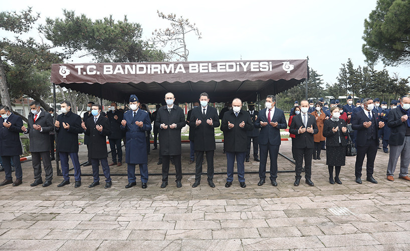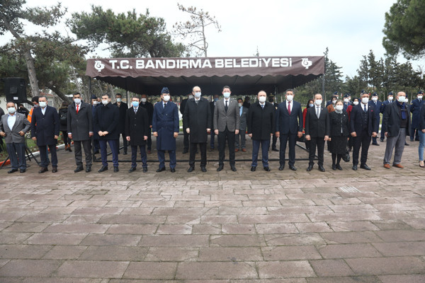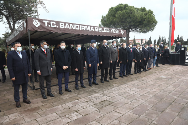 ÇANAKKALE ŞEHİTLERİ ŞEHİTLİKTE DÜZENLENEN TÖRENLE ANILDI 18 Mart Çanakkale Şehitlerini Anma ve Şehitler günü sebebiyle Bandırma Şehitliğinde tören düzenlendi. Törene İlçe Kaymakamı Günhan Yazar, Garnizon Komutanı Hv. Plt. Tuğ. General Oğuz Okuyucu, Bandırma Belediye Başkanı Av. Tolga Tosun, Cumhuriyet Başsavcısı Cüneyt Demirdaş, Adalet Komisyon Başkanı Mehmet Tarakçı, 17 Eylül Üniversitesi Rektörü Prof. Dr. Süleyman Özdemir, Emniyet Müdürü Soner Duran, İlçe Jandarma Komutanı Yzb. Mahir Mavi, İlçe Milli Eğitim Müdürü Mutlu Aslan, siyasi parti temsilcileri, dernek temsilcileri, şehit yakınları ve gaziler katıldı. Tören, şehitlik anıtına çelenk konulması, saygı duruşu saygı atışı ve İstiklal marşının okunması ile başladı. Ardından günün anlam ve önemini belirten konuşmayla devam edildi. Protokolün ve törene katılanların şehitlerin mezarlarına çiçek bırakması ile devam ederken, şehitlerin mezarları başında dualar okunmasının ardından tören sona erdi.