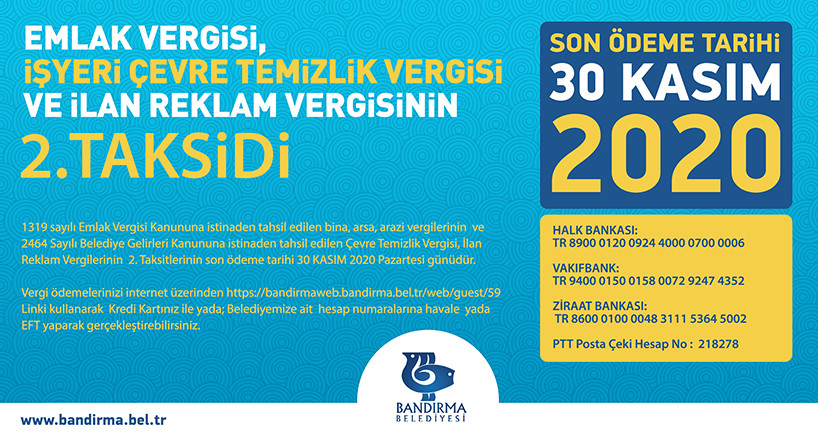 ÇEVRE TEMİZLİK VERGİSİ, İLAN REKLAM VERGİLERİNİN SON ÖDEMELERİ 30 KASIM   1319 sayılı Emlak Vergisi Kanununa istinaden tahsil edilen bina, arsa, arazi vergilerinin  ve  2464 Sayılı Belediye Gelirleri Kanununa istinaden tahsil edilen Çevre Temizlik Vergisi, İlan Reklam Vergilerinin  2. Taksitlerinin son ödeme tarihi 30 KASIM 2020 Pazartesi günüdür. Bu nedenle; vergi borcunun 2. taksitini ödemek isteyen mükelleflerimiz en geç 30 Kasım 2020 tarihine kadar ödemelerini gerçekleştirmeleri gerekmektedir.    Küresel çapta toplum sağlığını tehdit eden Korona virüs (COVİD-19) salgını nedeniyle temastan uzak durulması gereken bu dönemde, vergi ödemelerinizi internet üzerinden https://bandirmaweb.bandirma.bel.tr/web/guest/59 Linki kullanarak  Kredi Kartınız ile yada; Belediyemize ait  hesap numaralarına havale  yada EFT yaparak gerçekleştirebilirsiniz.    HALK BANKASI : TR 8900 0120 0924 4000 0700 0006 VAKIFBANK : TR 9400 0150 0158 0072 9247 4352 ZİRAAT BANKASI : TR 8600 0100 0048 3111 5364 5002 PTT Posta Çeki Hsp No : 218278     Ayrıca; Aksakal ve Edincik Mahallelerinde bulunan Belediyemize ait hizmet binalarında, Kapalı Pazar Yeri Yaşam Alanında ve Belediye Ana Hizmet binamızda bulunan veznelerimizde ödemelerini gerçekleştirmek isteyen mükelleflerimiz, HES KOD’ları sorgulandıktan sonra ödemelerini gerçekleştireceklerinden, ödeme yapacak vatandaşlarımızın, bulaş riskini azaltmak ve ödeme anında herhangi bir mağduriyet yaşamamaları adına kamu kurumlarında zorunlu hale getirilen HES KOD’larını önceden alıp hazır hale getirmeleri önem arz etmektedir.   Bandırma Belediyesi olarak; belediyemize ait tüm çalışma alanlarında; öncelikle sizin ve çalışanlarımızın sağlığı ve güvenliği için; Hijyen planımız çerçevesinde; iklimlendirme, hijyen ve dezenfeksiyon programlarını titizlikle sürdürerek hizmet vermekteyiz. Sağlıklı Günler dileriz.