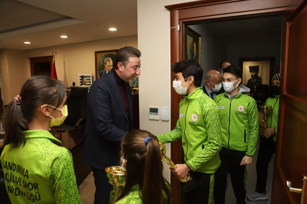 DERECEYE GİREN MODERN PENTATLON SPORCULARINDAN ZİYARET Bandırma Gençlik ve İlçe Spor Müdürü Hüseyin Elüstü, Modern Pentatlon İl Temsilcisi İzzettin Çalışır, Milli Takım Antrenörü Mehmet Yıldırım ve Bandırma İlçe Spor Müdürlüğü Modern Pentatlon Sporcuları Belediye Başkanı Av. Tolga Tosun’u makamında ziyaret ettiler. Ziyarette Gençlik ve İlçe Spor Müdürü Hüseyin Elüstü, İlçe Spor Müdürlüğü bünyesinde çalışmalarının sürdüren Modern Pentatlon sporcularının girmiş oldukları yarışmalarda derece yapan öğrenciler hakkında Başkan Av. Tolga Tosun’a bilgi verdi. Ayrıca çalışmalarında malzeme ve ekipman desteği ve sporcuların turnuva ve yarışmalara katılabilmesi için ulaşım desteği sağladığı için teşekkür etti. Sporcularla sohbet edip hepsini tebrik eden Başkan Av. Tolga Tosun: “Bandırmamız spor kentidir. Bandırmamızda her alandaki sporu, sporcularımızı ve kulüplerimizi destekliyoruz. Bandırmamızı Pentatlon alanında temsil ederek dereceye giren tüm sporcularımızı kutluyorum” dedi. Ziyaret sonunda Belediye Başkanı Av. Tolga Tosun, sporculara hediyelerini takdim ederek, başarılarının devamını diledi. Ziyarette Belediye Meclis Üyesi Eren Ülkü’de hazır bulundu.