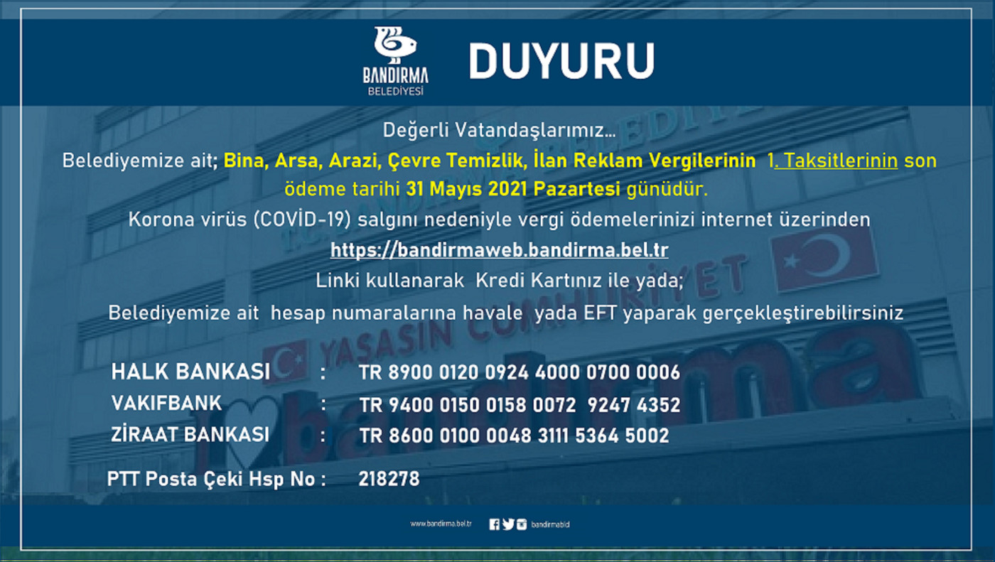 1319 sayılı Emlak Vergisi Kanununa istinaden tahsil edilen bina, arsa, arazi vergilerinin  ve  2464 Sayılı Belediye Gelirleri Kanununa istinaden tahsil edilen Çevre Temizlik Vergisi, İlan Reklam Vergilerinin  1. Taksitlerinin son ödeme tarihi 31 Mayıs 2021 Pazartesi günüdür. Bu nedenle; vergi borcunun 1. taksitini ödemek isteyen mükelleflerimiz en geç 31 Mayıs 2021 tarihine kadar ödemelerini gerçekleştirmeleri gerekmektedir. Küresel çapta toplum sağlığını tehdit eden Korona virüs (COVİD-19) salgını nedeniyle temastan uzak durulması gereken bu dönemde, vergi ödemelerinizi internet üzerinden https://bandirmaweb.bandirma.bel.tr Linki kullanarak  Kredi Kartınız ile yada; Belediyemize ait  hesap numaralarına havale  yada EFT yaparak gerçekleştirebilirsiniz.   HALK BANKASI : TR 8900 0120 0924 4000 0700 0006 VAKIFBANK : TR 9400 0150 0158 0072 9247 4352 ZİRAAT BANKASI : TR 8600 0100 0048 3111 5364 5002 PTT Posta Çeki Hsp No : 218278     Ayrıca; Aksakal ve Edincik Mahallelerinde bulunan Belediyemize ait hizmet binalarında, Kapalı Pazar Yeri Yaşam Alanında ve Belediye Ana Hizmet binamızda bulunan veznelerimizde ödemelerini gerçekleştirmek isteyen mükelleflerimiz, HES KOD’ları sorgulandıktan sonra ödemelerini gerçekleştireceklerinden, ödeme yapacak vatandaşlarımızın, bulaş riskini azaltmak ve ödeme anında herhangi bir mağduriyet yaşamamaları adına kamu kurumlarında zorunlu hale getirilen HES KOD’larını önceden alıp hazır hale getirmeleri önem arz etmektedir.