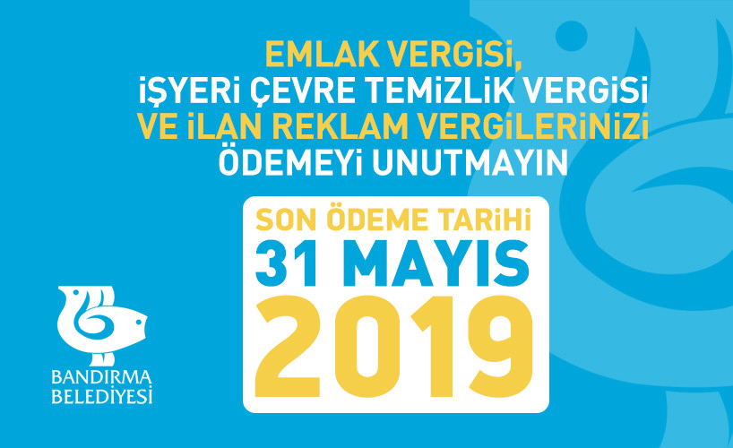 EMLAK VERGİSİ HATIRLATMA   Bandırma Belediyesi 2019 yılı Emlak Vergisi, Reklam Vergisi ve Çevre Temizlik Vergi (İş yeri) ödemelerinin ilk dönem ödemeleri 31 Mayıs’ta sona eriyor. 2019 yılı Emlak Vergisi, Reklam Vergisi ve İş yerleri için Çevre Temizlik Vergisinin 1. Taksit ödeme süresi 31 Mayıs 2019 Cuma günü sona erecek. Konuyla ilgili vatandaşlarımızın 31 Mayıs Cuma Günü mesai saati bitimine kadar Bandırma Belediyesi Tahsilat Servisine ya da E-Belediye üzerinden internet aracılığı ile ödeme yapmaları önemle rica olunur.