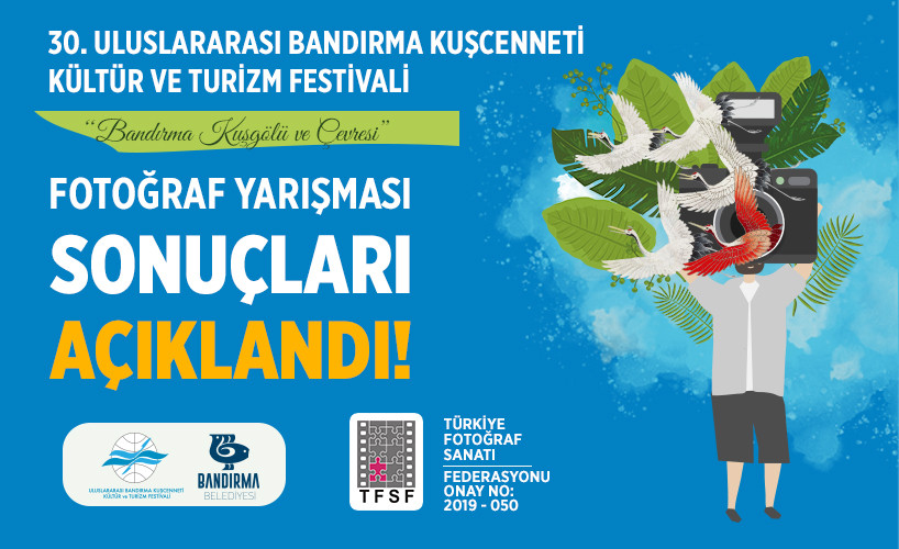 FOTOĞRAF YARIŞMASI SONUÇLANDI   Bandırma Belediyesi 30. Uluslararası Bandırma Kuşcenneti Kültür Ve Turizm Festivali kapsamında düzenlediği “Bandırma Kuşgölü ve Çevresi” konulu fotoğraf yarışması sonuçlandı.   Yarışma Jurisinde; Aramis Kalay, Levent Yavuz, Ömer Lütfi Bakan, Prof. Dr. Savaş Şener, Selçuk Özgüleryüz veTürkiye Fotoğraf Sanatı Federasyonu Temsilcisi Ömer Ersevinç yer aldı. 164 katılımcının toplam 584 fotoğrafla yer aldığı yarışmada 1. İbrahim Arslan, 2. Ali Şenel, 3. Ahmet Çetin oldu. Yarışmada dereceye giren fotoğraflar 17.09.2019 Festivalimizin 1. Günü Belediye Kültür Merkezi Galeri Salonunda saat 18.30’da sergilenecek. Sergiye tüm vatandaşlarımız davetlidir.   Yarışma Sonuçları İçin Tıklayınız