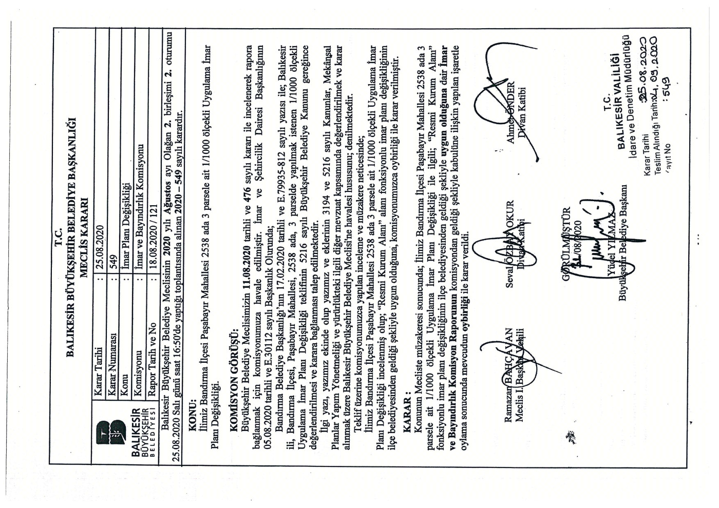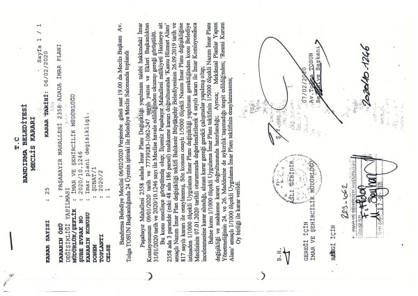İlçemiz Paşabayır Mahallesi 2358 ada 3 parselde ‘Resmi Kurum Alanı’ amaçlı Plan değişikliği teklifi Belediyemiz Meclisinin 06.02.2020 tarih ve 25 sayılı kararı ile kabul edilmiştir.    Onaylanan,  Plan değişikliği teklifi Balıkesir Büyükşehir Belediyesi Meclisinin 25.08.2020 tarih ve 549 sayılı kararı ile onanmış olup, 3194 sayılı İmar Kanunun 8/b maddesine istinaden bir ay süre ile ilan edilmek üzere askıya çıkarılmış olup; Belediyemiz İnternet sitesinde yayınlanmaktadır. İlgililere ilanen duyurulur.