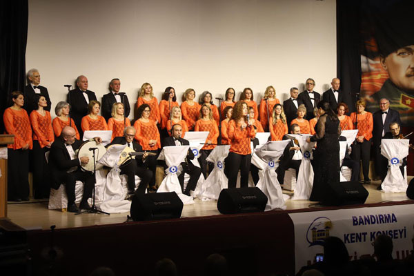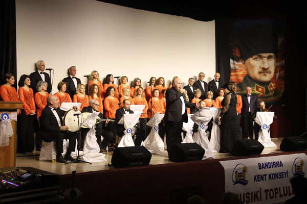 KENT KONSEYİ MUSIKİ TOPLULUĞUNDAN KIŞ KONSERİ   Bandırma Kent Konseyi Musıki Topluluğu tarafından düzenlenen, Şef Verda Dönmez yönetimindeki Kış Konseri Barış Manço Kültür Merkezinde Bandırmalı musıki severler ile buluştu. Konseri yakından takip eden Bandırma Belediye Başkanı Av. Tolga Tosun; "Belediye olarak daima sanatı ve sanatçılarımızı destekliyoruz. Birlik ve beraberlik içerisinde Kent Konseyimiz ile iş birliği yaparak şehrimizin sanata olan ilgisine karşılık vermeye çalışıyoruz. Böylesine güzel bir müzik ziyafeti ile Bandırmalıları buluşturdukları için Bandırma Kent Konseyi Musıki Topluluğuna teşekkür ederim" dedi.   Konser sonunda Başkan Av. Tolga Tosun, Şef Verda Dönmez’e çiçek taktim etti.