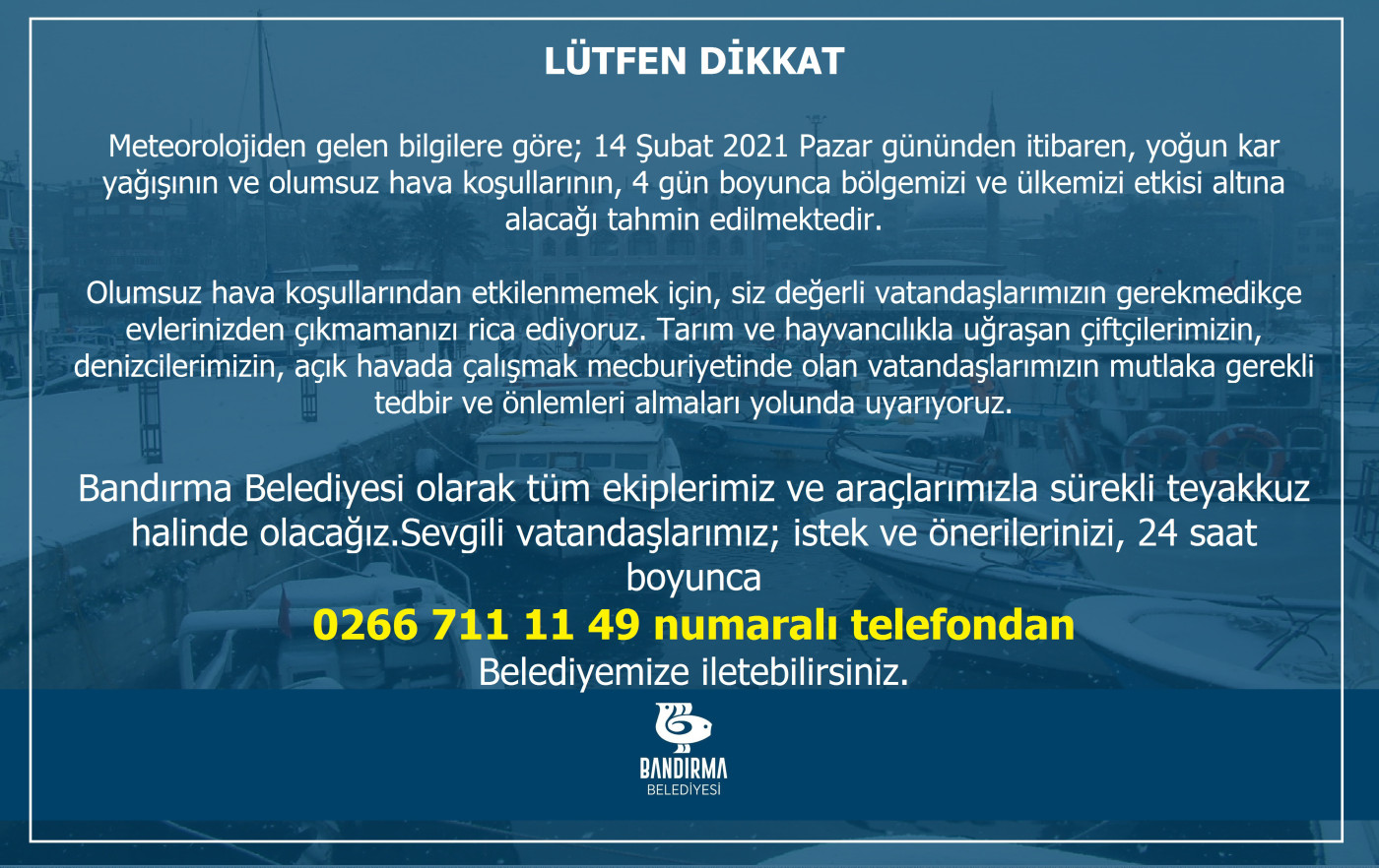 Meteorolojiden gelen bilgilere göre; 14 Şubat 2021 Pazar gününden itibaren, yoğun kar yağışının ve olumsuz hava koşullarının, 4 gün boyunca bölgemizi ve ülkemizi etkisi altına alacağı tahmin edilmektedir. Olumsuz hava koşullarından etkilenmemek için, siz değerli vatandaşlarımızın gerekmedikçe evlerinizden çıkmamanızı rica ediyoruz. Tarım ve hayvancılıkla uğraşan çiftçilerimizin, denizcilerimizin, açık havada çalışmak mecburiyetinde olan vatandaşlarımızın mutlaka gerekli tedbir ve önlemleri almaları yolunda uyarıyoruz. Bandırma Belediyesi olarak tüm ekiplerimiz ve araçlarımızla sürekli teyakkuz halinde olacağız. Sevgili vatandaşlarımız; istek ve önerilerinizi, 24 saat boyunca 0266 711 11 49 numaralı telefonla Belediyemize iletebilirsiniz.