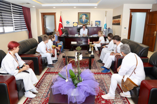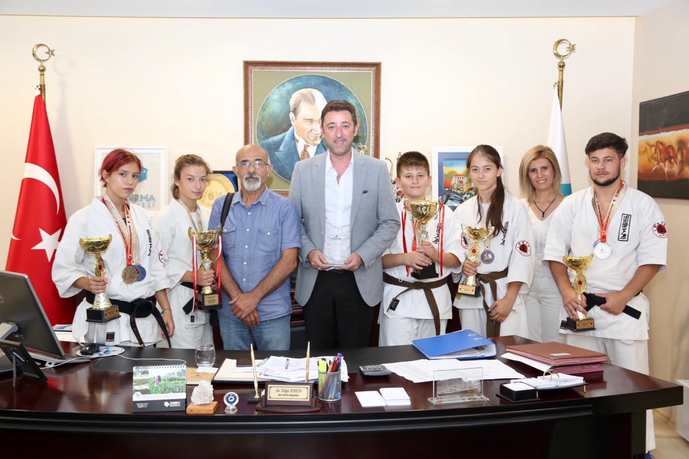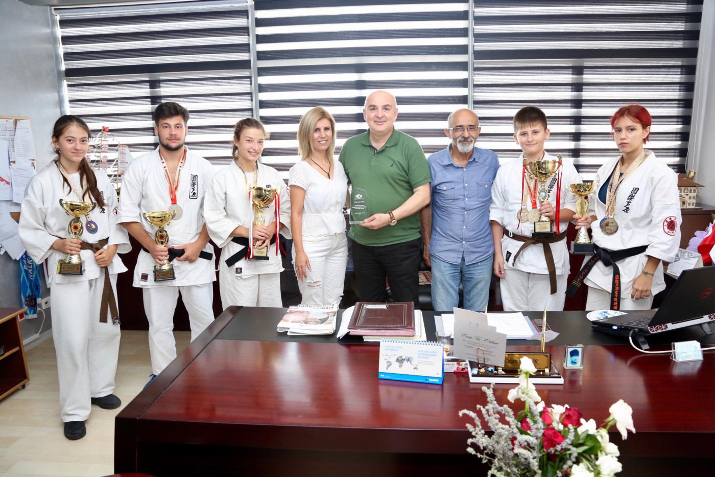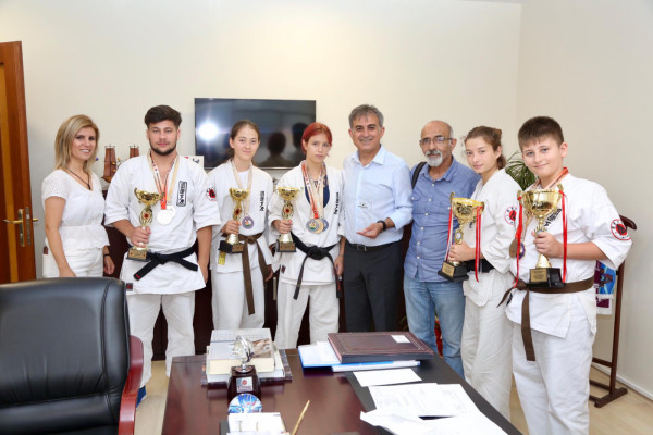 MİLLİ SPORCULARDAN BAŞKAN VE YARDIMCILARINA ZİYARET   10-14 Mart 2019 tarihleri arasında Antalya’da düzenlenen Türkiye Şampiyonasında gösterdikleri başarılı maçlarının ardından aldıkları dereceler neticesinde Milli Takıma seçilen, 3-7 Temmuz 2019 tarihleri arasında Ankara’da düzenlenen Uluslararası Kyokushin Şampiyonasında maçlarını da başarıyla kazanarak dereceye girdiler. Güzel ülkemizi en iyi şekilde temsil eden Bandırma Akademi Dövüş Sanatları GSK sporcularımız, Antrenörleri Sermet Ulufer ve Kulüp Başkan Yardımcısı Zeynep Ersin Bandırma Belediye Başkanı Av. Tolga Tosun, Başkan Yardımcıları Metin Ok ve Ozan Onur’u ziyaret ettiler.   Uluslararası Kyokushin Şampiyonasında dereceye girerek madalyalarını alan Milli Sporcular; 50 kg’de birinci olan Dilara Tandoğan, ikinci olan Aysima Ersin, 90 kg’de ikinci olan Batıkan Sulanç, 40 kg’da birinci olan Tuncay Çalışkan, 50 kg’de üçüncü olan Öznur Gülen’e ülkemizi ve Bandırmamızı en iyi şekilde temsil ettikleri için kutlayan ve başarılarının devamını dileyen Bandırma Belediye Başkanı Av. Tolga Tosun benzer şampiyonaların Bandırma’da yapılabilmesi için spor tesisi projelerini geliştirdiklerini ve önümüzdeki yıllarda Bandırma’ya spor salonu kazandıracaklarının müjdesini verdi.