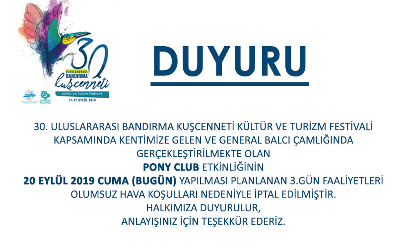 PONY CLUP ETKİNLİĞİNİN BUGÜNKİ PROGRAMI İPTAL EDİLMİŞTİR 30. Uluslararası Bandırma Kuşcenneti Kültür ve Turizm Festivali kapsamında kentimize gelen ve general balcı çamlığında gerçekleştirilmekte olan PONY CLUB etkinliğinin 20 Eylül 2019 Cuma (bugün) yapılması planlanan 3.gün faaliyetleri olumsuz hava koşulları nedeniyle iptal edilmiştir. Halkımıza duyurulur, anlayışınız için teşekkür ederiz.