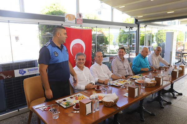 ŞANLA, GURURLA: TÜRK ZABITASI 195 YAŞINDA 4 Eylül 1826’da kurulan Belediye Zabıtası bugün 195. yılını kutluyor. Bandırma Belediye Başkanı Av. Tolga Tosun, Başkan Yardımcıları; Ozan Onur, Metin Ok, İsmail Ay, CHP İlçe Başkanı Selim Panç ile birlikte, Belediye Çamlık Parkta, Zabıta personeli ile bir araya geldiler. Zabıta Müdürü Serhat Ekinci Zabıta Gününü kutlayarak, Belediye Başkanı Av. Tolga Tosun’a ve tüm mesai arkadaşlarına teşekkür etti. Bandırma Belediye Başkanı Av. Tolga Tosun da öncelikle Zabıta Gününü kutlayarak: “Çok büyük bir tarihin ve çok önemli görevlerinizin sorumluluğunu taşıyorsunuz. Sizler Belediyemizin güler yüzü, içten yardım severliği, bütün vatandaşlarımıza eşit davranan adalet duygumuzsunuz. Her ne olursa olsun, yetki ve sorumluluklarınızla, görevinizi en doğru şekilde yapacağınızdan, Bandırma Belediyesini en iyi şekilde temsil edeceğinizden şüphe duymuyorum. Verdiğiniz tüm emekler için teşekkür ediyor, Zabıta Gününüzü, 195. yılınızı içtenlikle kutluyorum” dedi.