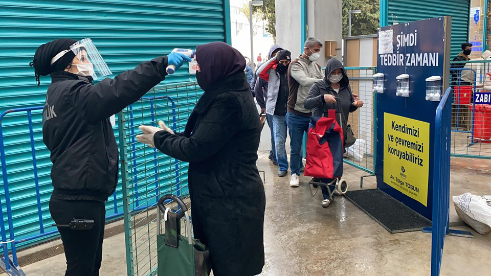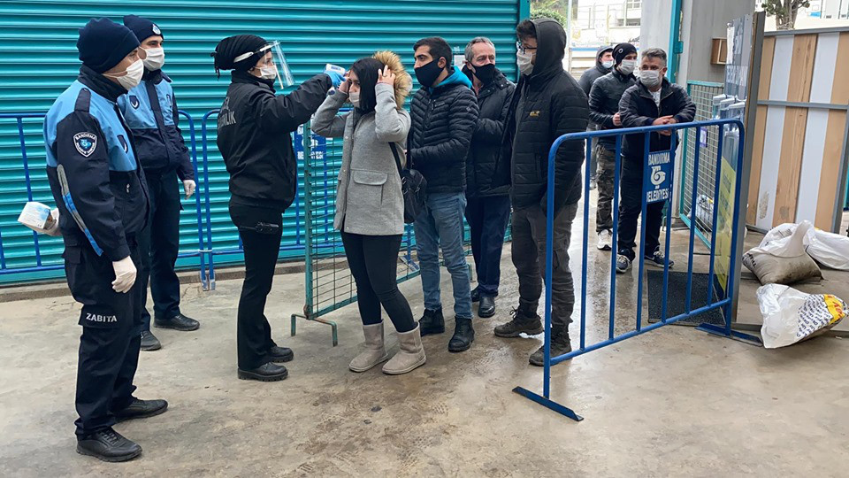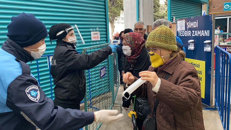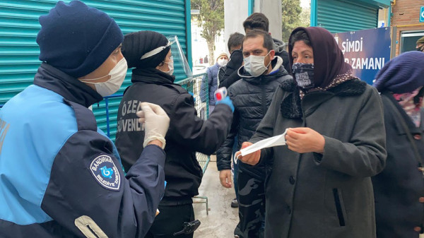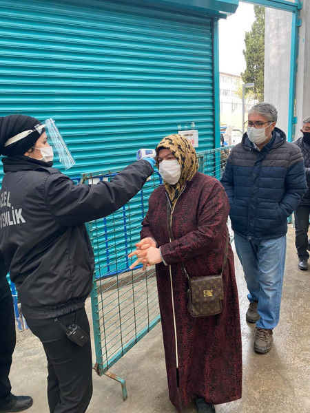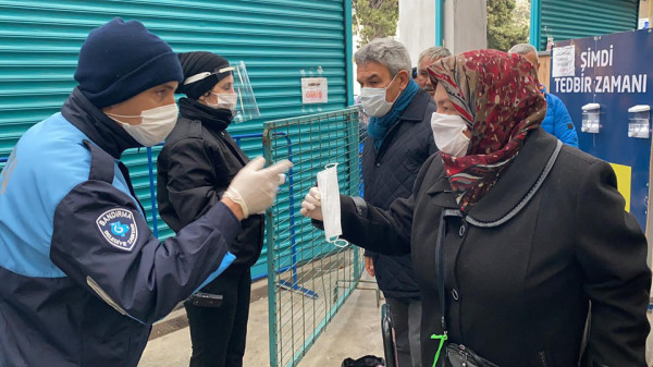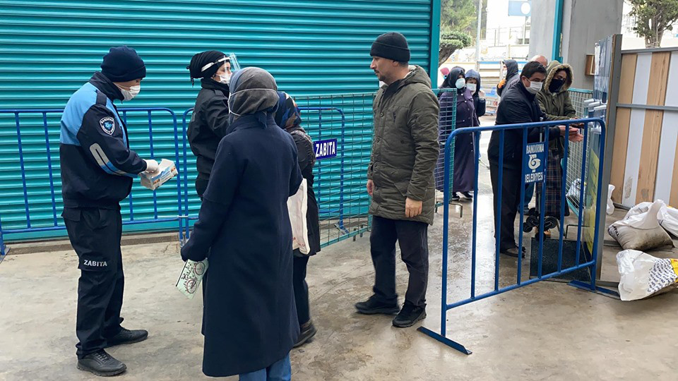 Bandırma Belediyesi, Kapalı Pazar Yerinde vatandaşlarımızın daha sağlıklı bir şekilde alışverişlerini yapabilmeleri için gerekli tedbirleri almaya devam ediyor. Ekipler Çarşamba Pazarı’nın kurulduğu Kapalı Pazar Yerinde girişte maskesi olmayan yada koruma işlevi görmeyecek maskelerle gelen vatandaşlara maske dağıtırken diğer yandan da ateş ölçümleri de yaparak her hangi bir risk durumu olup olmadığını kontrol ediyor. Öte yandan hafta sonunda tekrar uygulanacak olan sokağa çıkma yasağı nedeniyle cumartesi günü kurulamayacak olan Sebze ve Meyve Pazarı yoğunluğu aza indirmek ve halkımızın mağdur olmamasını sağlamak amacıyla CUMA günü kurulacağı belirtildi.