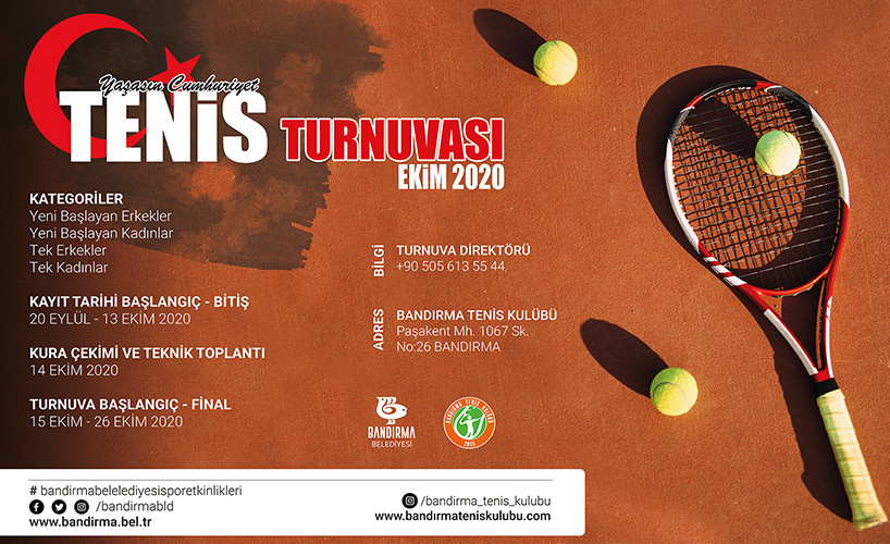 YAŞASIN CUMHURİYET TENİS TURNUVASI Bandırma Belediyesi ve Bandırma Tenis Kulübünün 15 – 26 Ekim tarihleri arasında ortaklaşa gerçekleştireceği “Yaşasın Cumhuriyet Tenis Turnuvası” katılımcılarını bekliyor. Yeni Başlayan Erkekler – Yeni Başlayan Kadınlar – Tek Erkekler – Tek Kadınlar olarak 4 ayrı kategoride düzenlenecek olan turnuva kayıtları 13 Ekim tarihine kadar devam edecektir. 14 Ekim Saat: 20:30 ‘da Bandırma Tenis Kulübünde Teknik toplantı ve Kura çekimleri yapılacaktır. Ön kayıtlar www.bandirmateniskulubu.com adresinden yada 05056135544 nolu telefon numarasından yapılabilmektedir. Bandırma Belediyesi olarak ilçemizdeki spor kulüplerine destek sağlamak amacıyla pandemi döneminde fiziki mesafeye uygun olan Tenis turnuvasına tüm tenis severleri ve Bandırma halkını davet ediyoruz.