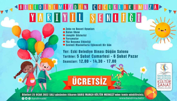 Bandırma Belediyesi ders yılının yarı dönemini geride bırakan çocuklarımız için 5-6 Şubat 2022 tarihlerinde Eski Belediye Düğün Salonunda "Çocuk Şenliği" organizasyonu düzenledi.