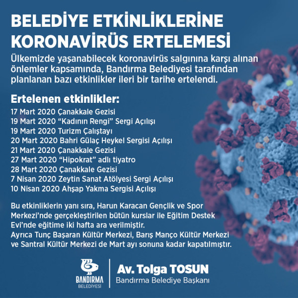 Vatandaşlarımızın sağlığını tehdit eden COVİD 19 (Corona) virüsüne önlem almak amacıyla, Bandırma Belediyemiz tarafından otobüsler, Resmi hizmet veren tüm kurum ve kuruluşlar, Aile