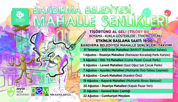 Bandırma Belediyesi Kültür ve Sanat Etkinlikleri kapsamında kentimizde düzenlenen kültürel etkinlikleri arttırmak ve yeni faaliyetleri vatandaşları buluşturmak amacıyla Mahalle Ş