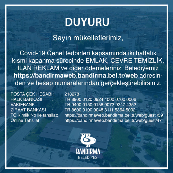 Covid-19 Genel tedbirleri kapsamında iki haftalık kısmi kapanma sürecinde EMLAK, ÇEVRE TEMİZLİK, İLAN REKLAM ve diğer ödemelerinizi Belediyemiz https://bandirmaweb.bandirma.bel.tr/