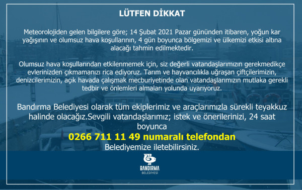 Bandırma Belediyesi olarak tüm ekiplerimiz ve araçlarımızla sürekli teyakkuz halinde olacağız.