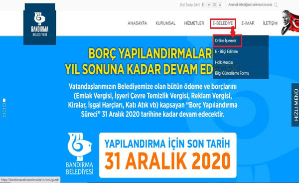 Yeni uygulamayla vatandaşlarımız belediyemize gelmeden her tülü borç yapılandırmalarını Bandırma Belediyesi resmi internet sayfası olan “www.bandirma.bel.tr” sayfasından yapabilirl