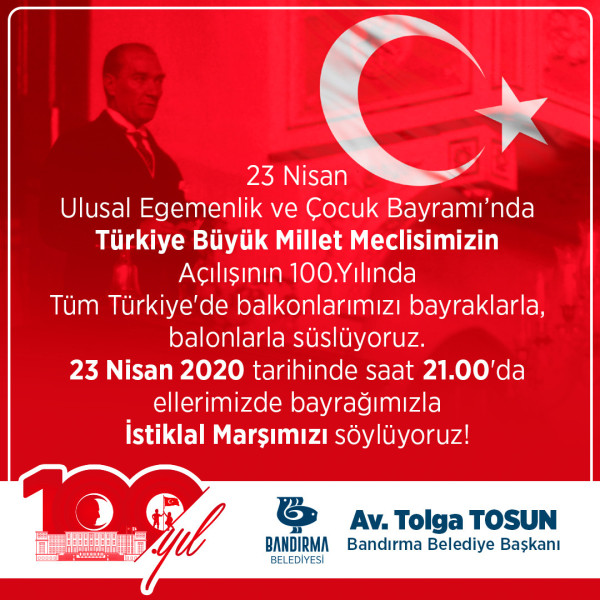 23 Nisan Perşembe günü evlerimizi, balkonlarımızı bayraklarımızla süsleyeceğiz ve saat 21:00’da tüm Bandırma tek yürek İstiklal Marşı’mızı hep birlikte söyleyeceğiz.