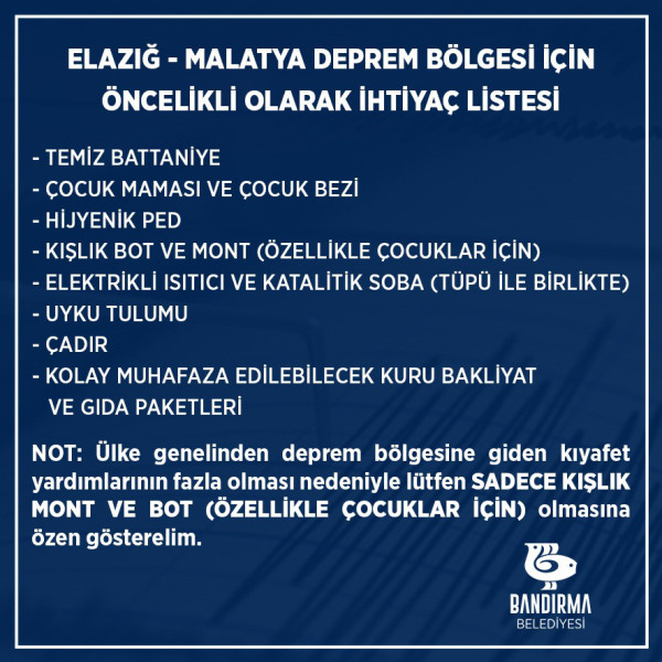 Yardımlarımızın daha nitelikli hale gelmesi için; değerli vatandaşlarımızın oluşturulan listeyi dikkate alarak kampanyaya katılmalarını önemle rica ederiz.