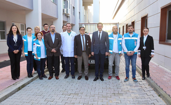 Bandırma Belediye Başkanı Av. Tolga Tosun, Bandırma Devlet Hastanesi Hasta Bakım Ünitesine evde bakım hizmeti için alınan aracı Bandırma Devlet Hastanesi Başhekimi Ethem Karpuz’a t