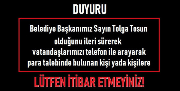 Belediye Başkanımız Sayın Tolga Tosun olduğunu ileri sürerek vatandaşlarımızı telefon ile arayarak para talebinde bulunan kişi yada kişilere LÜTFEN İTİBAR ETMEYİNİZ!